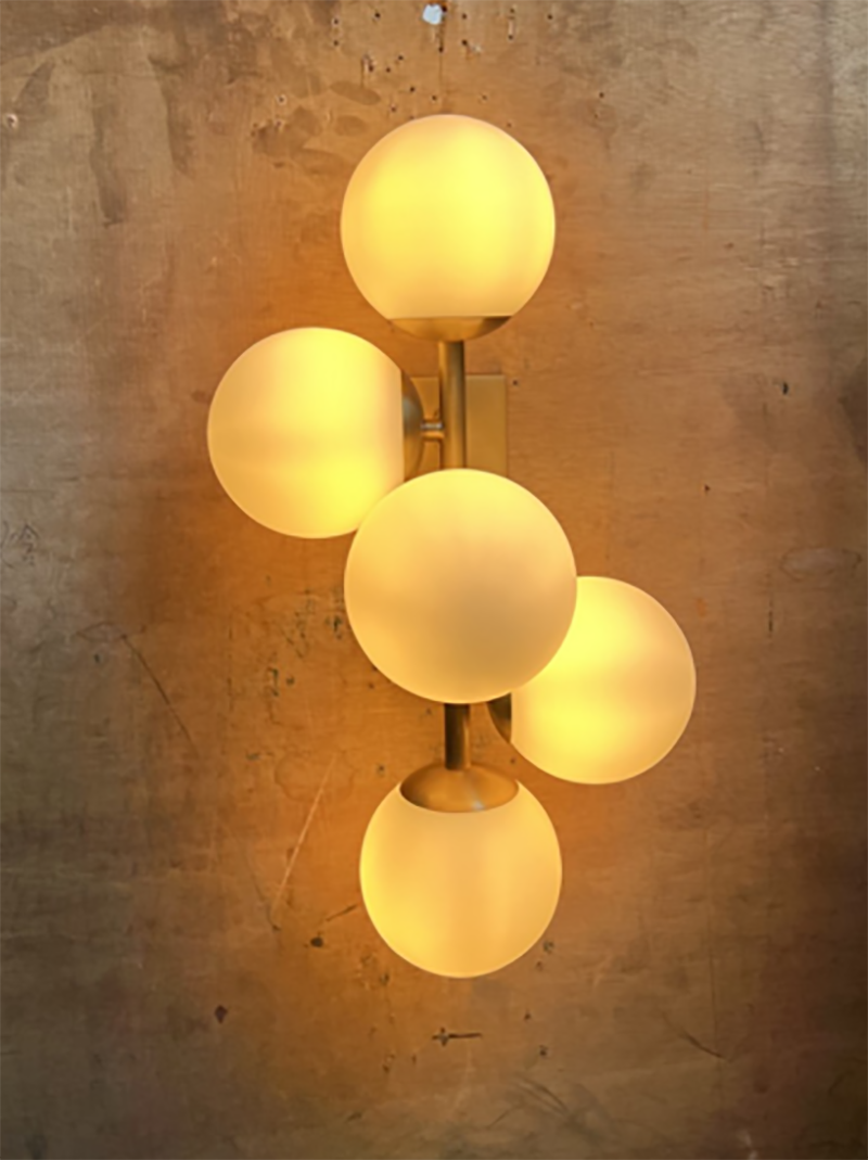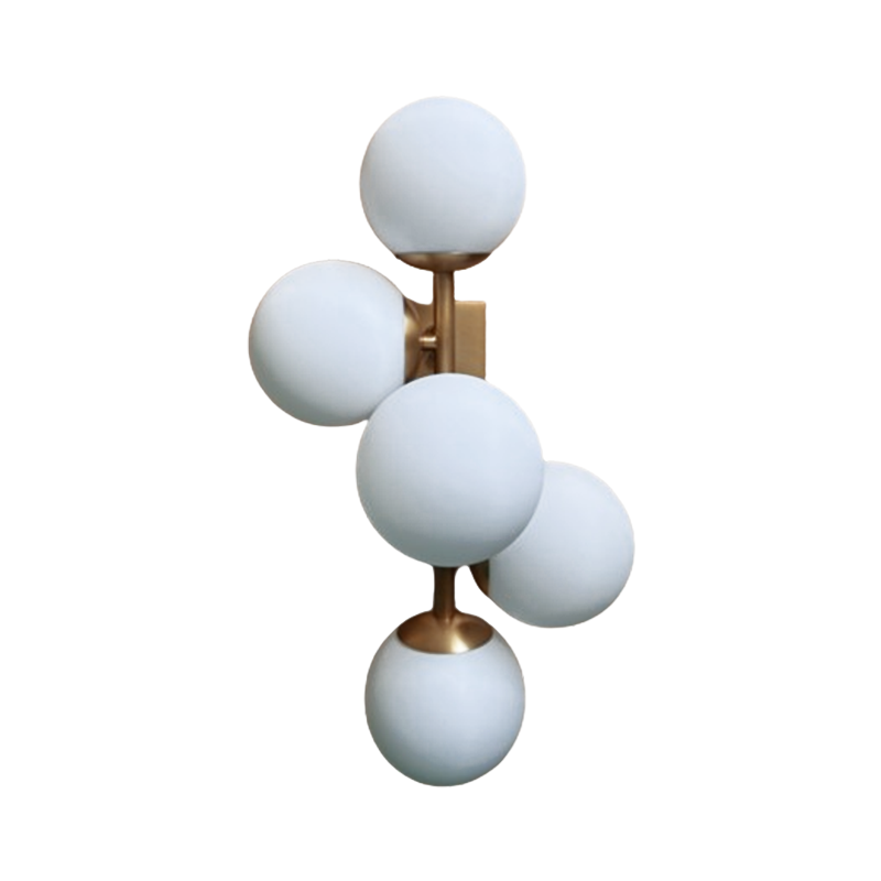 With its playful design, this lamp flaunts an airy look. While the antique brass finish of its fixture adds a chic touch, four spherical white glass shades spread a warm and soft light throughout the room.